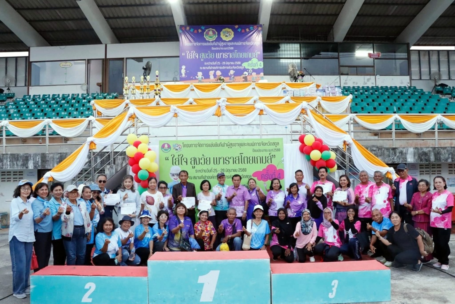 วันที่ 25 มิถุนายน 2568 ณ สนามกีฬาองค์การบริหารส่วนจังหวัดสตูล องค์การบริหารส่วนจังหวัดสตูล (อบจ.สตูล) จัดพิธีเปิดการแข่งขันกีฬาผู้สูงอายุและคนพิการ จังหวัดสตูล ประจำปีงบประมาณ พ.ศ. 2568 “ใส่ใจ สูงวัย พารา สโตยเกมส์” ครั้งที่ 4 โดยนายศักระ กปิลกาญจน์ ผู้ว่าราชการจังหวัดสตูล มอบหมายให้ นายคณิต คงช่วย รองผู้ว่าราชการจังหวัดสตูล เป็นประธานในพิธีเปิด พร้อมด้วยนายสัมฤทธ์ เลียงประสิทธิ์ นายกองค์การบริหารส่วนจังหวัดสตูล กล่าวรายงานถึงวัตถุประสงค์ของการจัดงาน
