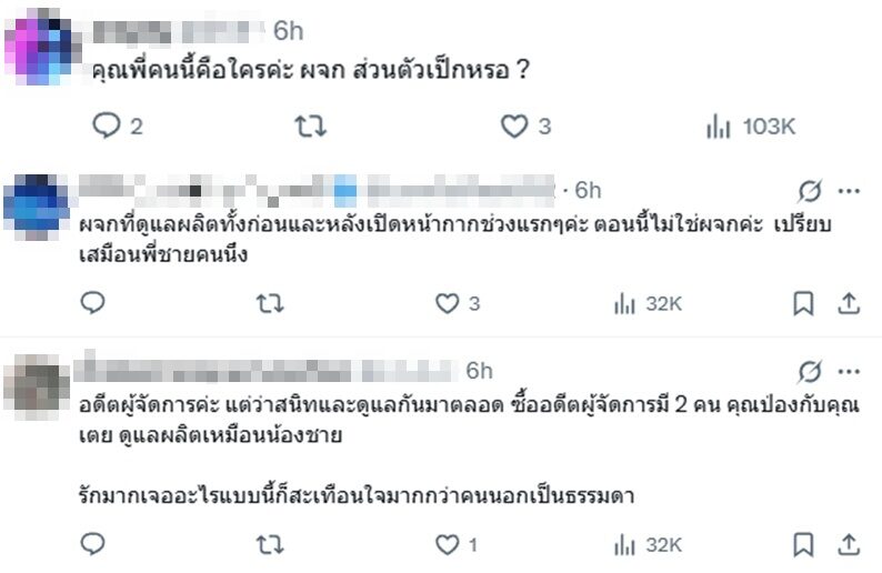 -อดีตผู้จัดการค่ะ แต่ว่าสนิทและดูแลกันมาตลอด อดีตผู้จัดการมี 2 คน คุณป่องกับคุณเตย ดูแลผลิตเหมือนน้องชาย รักมากเจออะไรแบบนี้ก็สะเทือนใจมากกว่าคนนอกเป็นธรรมดา