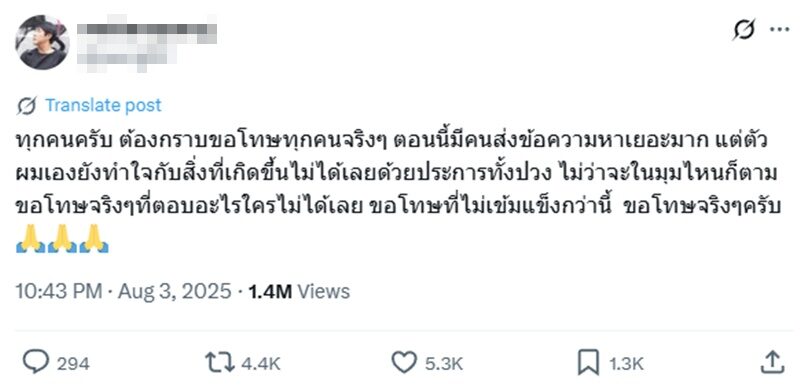 ขณะที่ เจ้าของ X (ทวิตเตอร์) รายหนึ่งโพสต์ข้อความชี้แจงว่า “ทุกคนครับ ต้องกราบขอโทษทุกคนจริงๆ ตอนนี้มีคนส่งข้อความหาเยอะมาก แต่ตัวผมเองยังทำใจกับสิ่งที่เกิดขึ้นไม่ได้เลยด้วยประการทั้งปวง ไม่ว่าจะในมุมไหนก็ตาม ขอโทษจริงๆที่ตอบอะไรใครไม่ได้เลย ขอโทษที่ไม่เข้มแข็งกว่านี้ ขอโทษจริงๆครับ ”