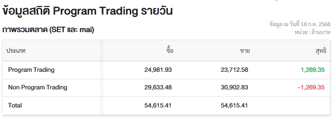 ขณะที่มูลค่าซื้อขายรายวันผ่าน Non Program Trading หรือ “การซื้อขายที่ไม่ใช่โปรแกรม” มีมูลค่าซื้อจำนวน 29,633.48 ล้านบาท และมูลค่าขายจำนวน 30,902.83 ล้านบาท เท่ากับขายสุทธิ 1,269.35 ล้านบาท