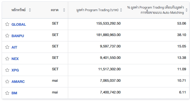 นอกจากนี้ ตลท.ยังรายงานข้อมูลหลักทรัพย์ที่ใช้ Program Trading ซื้อขายสูงสุด 7 อันดับ โดยเรียงจากเปอร์เซ็นต์ (%) มูลค่า Program Trading เทียบกับมูลค่าการซื้อขายแบบ Auto Matching ดังนี้