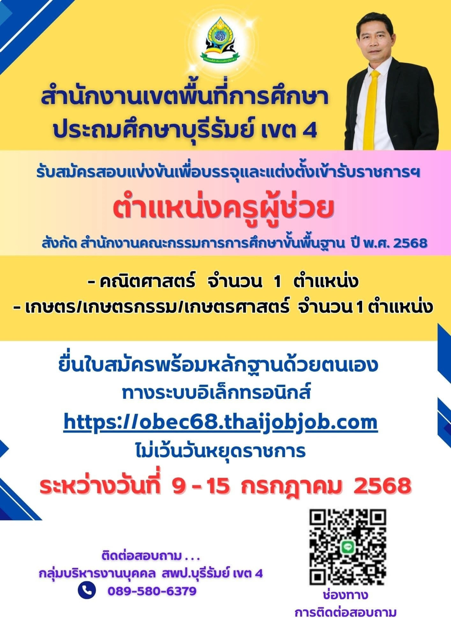 ประกาศ อ.ก.ค.ศ.เขตพื้นที่การศึกษาประถมศึกษาบุรีรัมย์ เขต 4 เรื่อง รับสมัครสอบแข่งขันเพื่อบรรจุและแต่งตั้งบุคคลเข้ารับราชการเป็นข้าราชการครูและบุคลากรทางการศึกษา ตำแหน่งครูผู้ช่วย สังกัดสำนักงานคณะกรรมการการศึกษาขั้นพื้นฐาน ปี พ.ศ. 2568