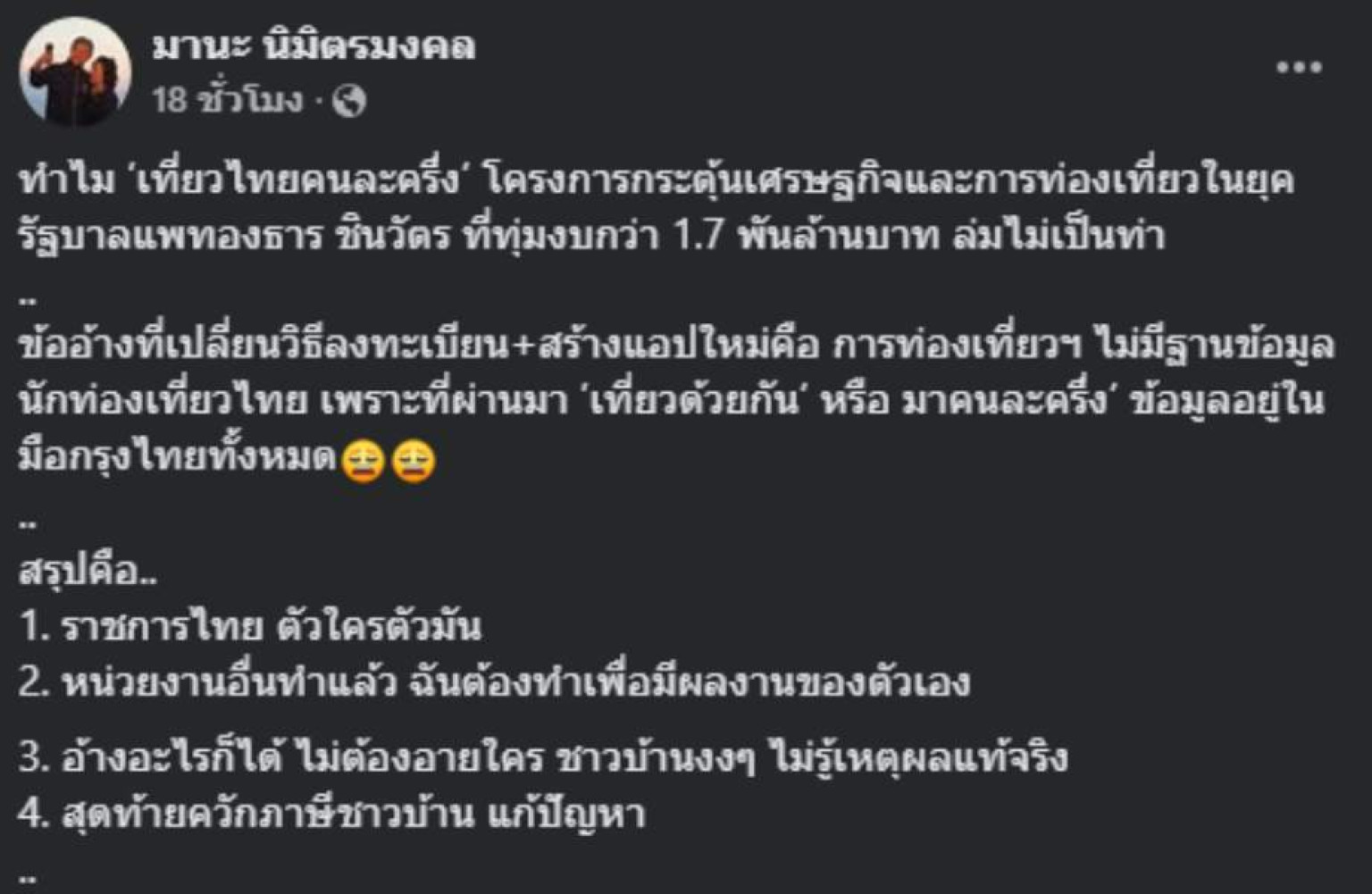 "ดร.มานะ" วิเคราะห์ 4 เหตุผล โครงการ "เที่ยวไทยคนละครึ่ง" ยุคแพทองธาร งบบาน 1.7 พันล้าน แต่ล่มไม่เป็นท่า