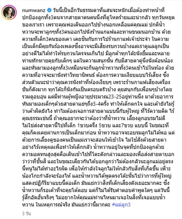 “คือน้ำหวานอาจจะไม่ได้พิมพ์ลงไปทั้งหมด แล้วขอเล่าก่อนว่าที่พิมพ์ลงไปนั่นต้องการให้กำลังใจคนเป็นแม่ที่เจออย่างเรา ไม่ได้ไปติหรือว่าใคร เพราะถ้าเราตั้งใจว่าจะไปติหรือชี้นำว่าใคร ถ้าเราจะว่าใครเราคงมีคลิปวิดีโอหรือมีภาพคาดหน้าเพื่อให้คนเข้าใจมากกว่านี้ เรารู้สึกวันนั้นคือสิ่งที่เราเจอ สิ่งที่ลูกเราเจอในมุมเราที่เรารู้สึกและสื่อสารออกไป”