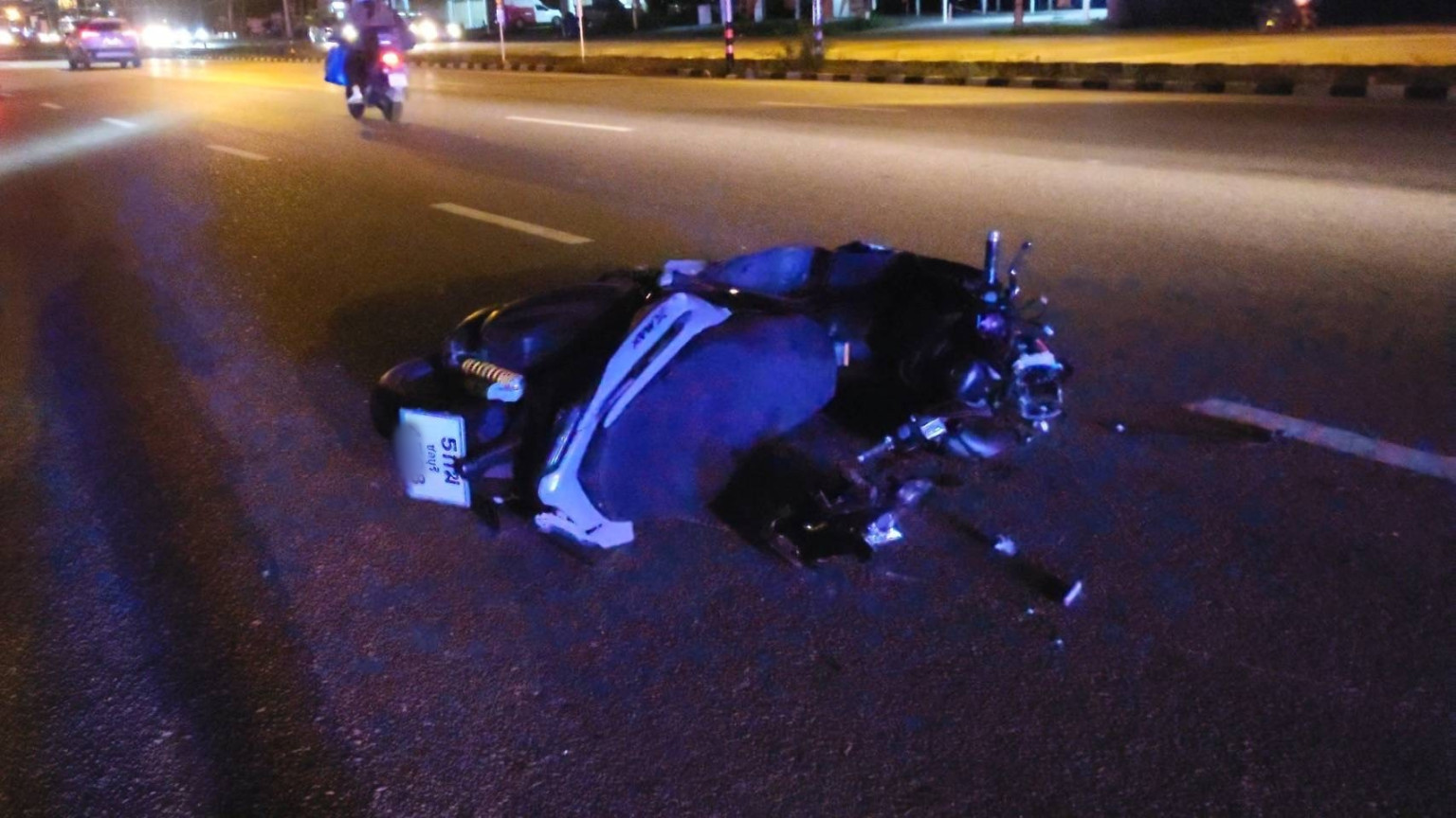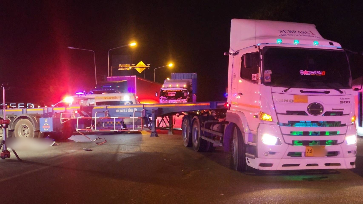 ที่เกิดเหตุพบรถพ่วง 18 ล้อ หมายเลขทะเบียน 74-xxxx ชลบุรี หมายเลขทะเบียนส่วนหาง 74-xxxx ชลบุรี จอดขวางถนน รถจักรยานยนต์ยี่ห้อยามาฮ่า เอ็นแมก สีดำ หมายเลขทะเบียน 5กฆ xxxx ชลบุรีเสียหลักพุ่งชนช่วงพ่วง จนได้รับความเสียหายยับเยิน บนพื้นถนนพบผู้เสียชีวิต เป็นผู้ชายไม่ทราบสังฆ อายุประมาณ 30 ถึง 40 ปี ไม่พบเอกสารแสดงตัวบุคคล อยู่ในสภาพกะโหลกศีรษะแตก มันสมองและเลือดไหลนองไปทั่วพื้นเป็นที่น่าสยดสยอง เจ้าหน้าที่จึงใช้ผ้าขาวคลุม กันเป็นที่อุดจาดตา พร้อมกันผู้ไม่เกี่ยวข้องออกห่างจากที่เกิดเหตุ