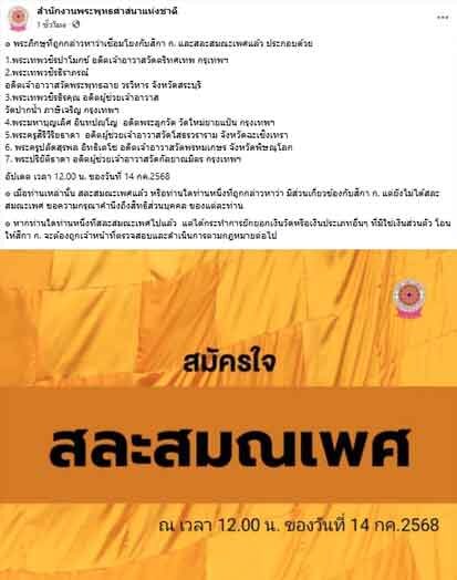 อัปเดต เวลา 12.00 น. วันที่ 14 กค.2568 เมื่อท่านเหล่านั้น สละสมณเพศแล้ว หรือท่านใดท่านหนึ่งที่ถูกกล่าวหามีส่วนเกี่ยวข้องกับสีกา ก. แต่ยังไม่ได้สละสมณเพศ ขอความกรุณาคำนึงถึงสิทธิส่วนบุคคลของแต่ละท่าน หากท่านใดท่านหนึ่งที่สละสมณเพศไปแล้ว แต่ได้กระทำการยักยอกเงินวัดหรือเงินประเภทอื่นๆ ที่มิใช่เงินส่วนตัว โอนให้สีกา ก. จะต้องถูกเจ้าหน้าที่ตรวจสอบและดำเนินการตามกฎหมายต่อไป