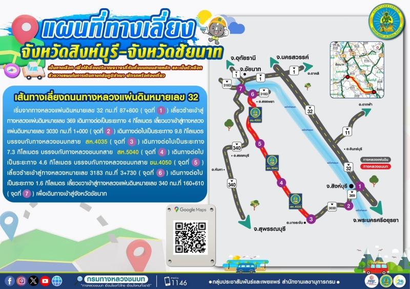 1. เส้นทางเลี่ยงการจราจรจังหวัดสิงห์บุรี – ชัยนาท สามารถเลี่ยงการจราจร ทล.32 (ถนนสายเอเชีย) ช่วงจังหวัดสิงห์บุรี ถึงชัยนาท โดยให้ใช้ทางหลวงชนบท สห.4035 สห.5040 และ ชน.4050 มุ่งหน้าขึ้นสู่ภาคเหนือ