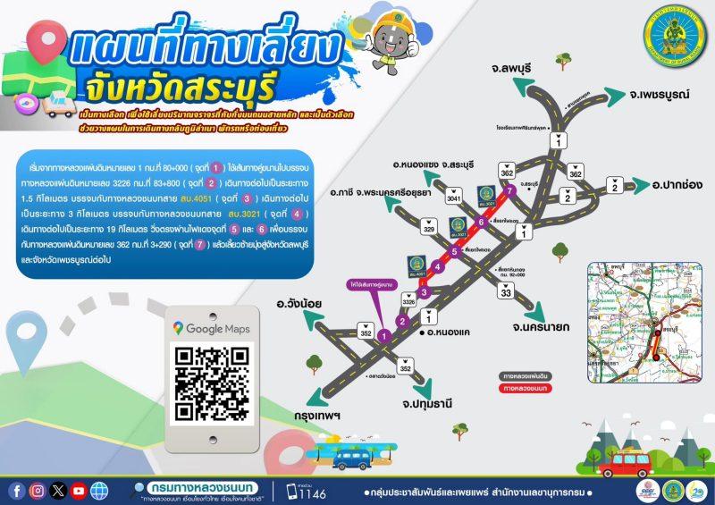 5. เส้นทางเลี่ยงการจราจรจังหวัดสระบุรี เพื่อเลี่ยงการจราจร ทล.1 (ถนนพหลโยธิน) ช่วงอำเภอวังน้อย จังหวัดพระนครศรีอยุธยา ถึงตัวเมืองสระบุรี โดยให้ใช้ทางหลวงชนบท สบ.4051 และ สบ.3021 เพื่อมุ่งหน้าสู่จังหวัดลพบุรี เพชรบูรณ์ และนครราชสีมา