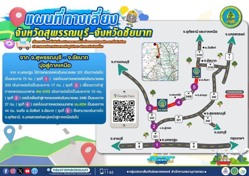 2. เส้นทางเลี่ยงการจราจรจังหวัดสุพรรณบุรี – ชัยนาท หากต้องการเลี่ยง ทล.340 โดยให้ใช้ทางหลวงชนบท สพ.4059 และ ชน.4054 เพื่อมุ่งหน้าสู่จังหวัดอุทัยธานี และนครสวรรค์
