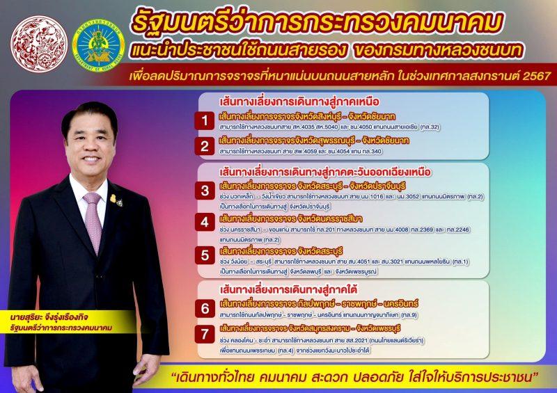 นายสุริยะ จึงรุ่งเรืองกิจ รมต. คมนาคม เปิดเผยว่า ในช่วงวันหยุดเทศกาลสงกรานต์ 2567 รัฐบาลได้ประกาศให้มีวันหยุดราชการพิเศษเพิ่มเติม รวมเป็น 5 วัน ตั้งแต่วันที่ 12 – 16 เมษายน 2567 กระทรวงคมนาคมคาดการณ์ว่าประชาชนจะเดินทางด้วยรถยนต์ส่วนบุคคล เพื่อกลับภูมิลำเนาและเดินทางท่องเที่ยวเป็นจำนวนมาก ซึ่งจะส่งผลให้มีปริมาณการจราจรหนาแน่นบนถนนสายหลัก จึงขอแนะนำประชาชนใช้ถนนสายรองของกรมทางหลวงชนบท (ทช.) เพื่อแบ่งเบาปริมาณการจราจร และใช้เป็นเส้นทางเลือกในการเดินทางไปจังหวัดต่าง ๆ ได้ โดยได้สั่งการให้ ทช. เตรียมความพร้อมเส้นทางและเจ้าหน้าที่ดูแลอำนวยความปลอดภัยในการเดินทางให้กับประชาชน ภายใต้การรณรงค์ “เดินทางทั่วไทย คมนาคม สะดวก ปลอดภัย ใส่ใจให้บริการประชาชน” โดยมีเส้นทางเลี่ยง 7 เส้นทาง ดังนี้