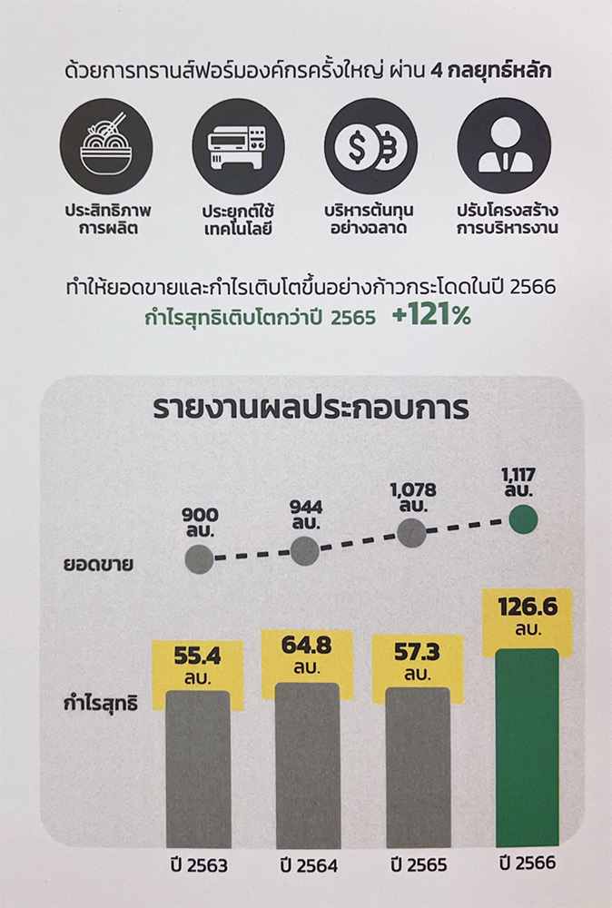 ในแง่รายได้ เมื่อปี 2566 บริษัททำรายได้รวม 1,117 ล้านบาท และทำกำไรสุทธิ 126.6 ล้านบาท โดยกำไรสุทธิปี 2566 เติบโตถึง 121% จากปีก่อนหน้า เพราะบริษัทเริ่มปรับโครงสร้างธุรกิจมาตั้งแต่ปี 2565 เริ่มนำผู้บริหารมืออาชีพและทีมงานคนรุ่นใหม่เข้ามาบริหารธุรกิจ เกิดการปรับปรุงประสิทธิภาพการผลิต บริหารต้นทุนให้ดีขึ้น จนลดต้นทุนได้สำเร็จ