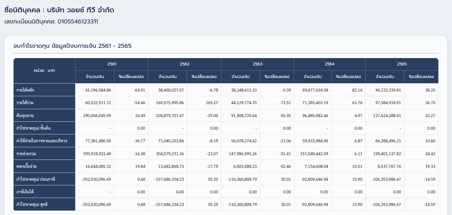 ข้อมูลจากกรมพัฒนาธุรกิจการค้า เปิดเผยว่า ผลประกอบการของ บริษัท วอยซ์ทีวี จำกัด ตั้งแต่ปี 2561-2565 เป็นดังนี้