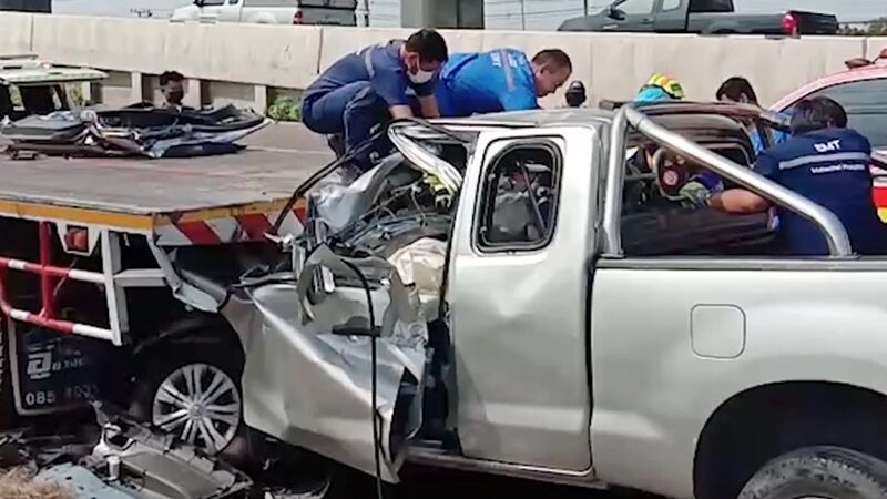 ชนดับคาซาก ต้องใช้ตัดถ่างงัดกระบะเสยอัดท้ายสิบล้อจอดซ้ายลงไปกินเตี๋ยว