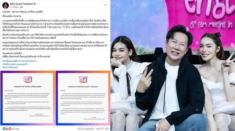จากกรณี เพจ Miss Grand Thailand แจ้งว่า ชาล็อต ออสติน ตกเป็นเหยื่อของมิจฉาชีพ โดยมิจฉาชีพได้ใช้กลอุบายในการหลอกลวงเงินจำนวน 4 ล้านบาท พร้อมบังคับให้วิดีโอคอลตลอด 24 ชั่วโมง ตั้งแต่วันที่ 7 ธันวาคม เวลา 17.00 น. ปัจจุบัน ชาล็อตปลอดภัยแล้ว และได้ดำเนินการแจ้งความลงบันทึกประจำวันเป็นที่เรียบร้อย