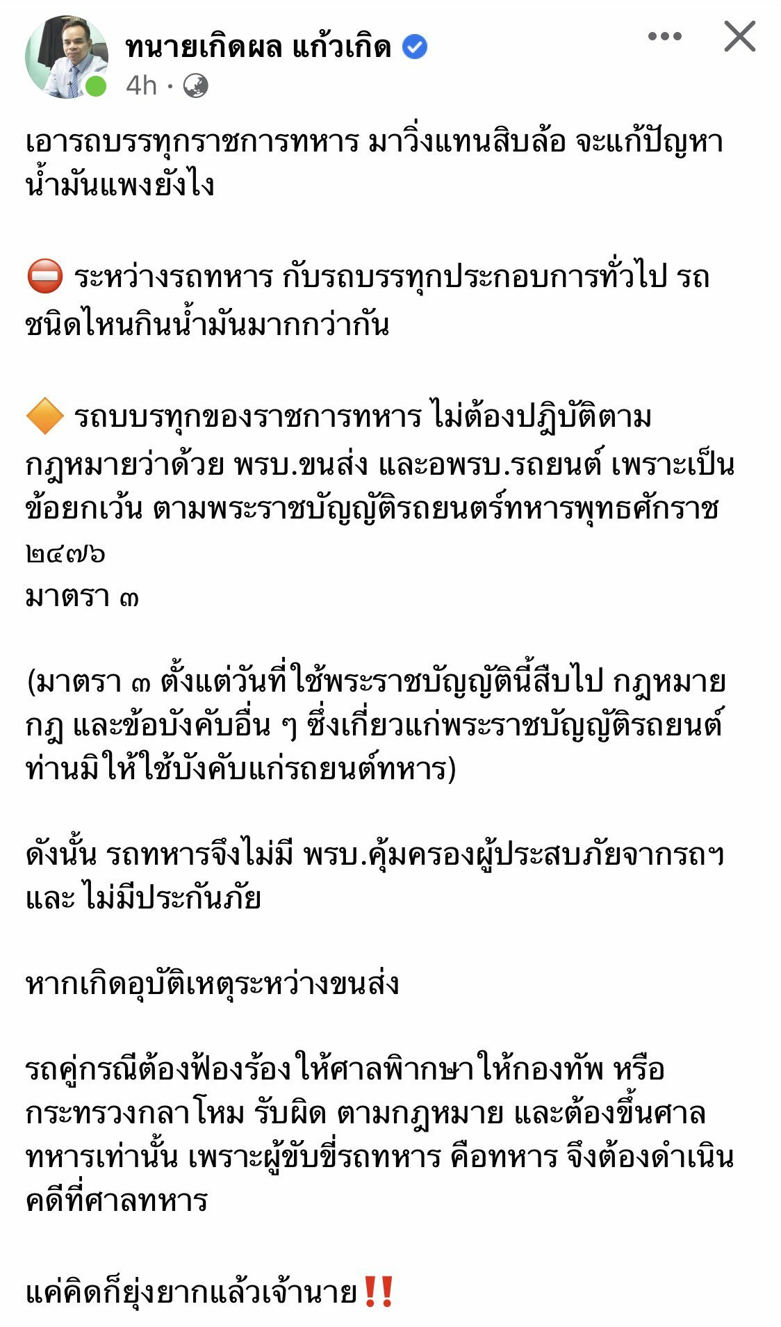 “ทนายเกิดผล” ระบุ รถทหาร ไม่ต้องปฏิบัติตามกฎหมาย พ.ร.บ.ขนส่ง และ พ.ร.บ.รถยนต์ เพราะยกเว้นตาม พ.ร.บ.รถยนต์ทหาร 2476 แต่ไม่มี พ.ร.บ.คุ้มครองผู้ประสบภัย และประกันภัยฯ กรณีเกิดอุบัติเหตุ คู่กรณีต้องฟ้องร้องกลาโหม หรือกองทัพ คนขับต้องขึ้นศาลทหาร