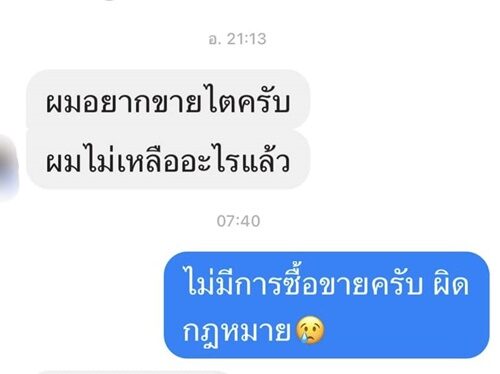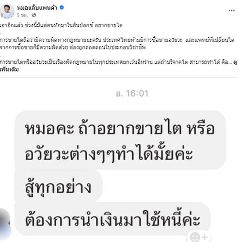"เอาอีกแล้ว ช่วงนี้มีแต่คนทักมาในอินบ๊อกซ์ อยากขายไต การขายไต ถือว่ามีความผิดทางกฎหมายนะครับ ประเทศไทยห้ามมีการซื้อขายอวัยวะ และแพทย์ที่เปลี่ยนไตจากการซื้อขาย ก็มีความผิดด้วย ต้องถูกถอดถอนใบประกอบวิชาชีพ