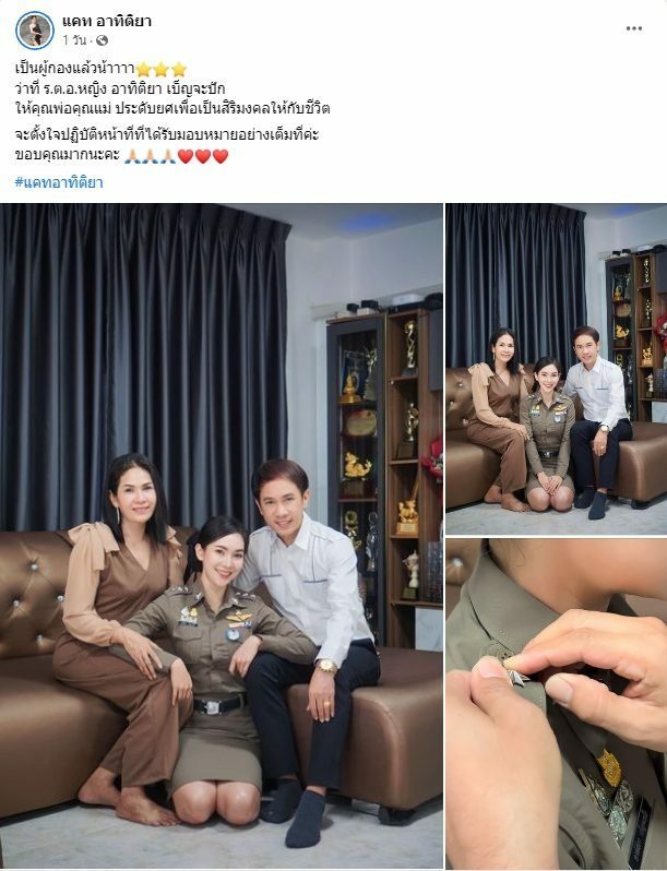 โดยระบุข้อความ ‘เป็นผู้กองแล้วน้าาาา ว่าที่ ร.ต.อ.หญิง อาทิติยา เบ็ญจะปัก ให้คุณพ่อคุณแม่ ประดับยศเพื่อเป็นสิริมงคลให้กับชีวิต จะตั้งใจปฏิบัติหน้าที่ที่ได้รับมอบหมายอย่างเต็มที่ค่ะ ขอบคุณมากนะคะ #แคทอาทิติยา’