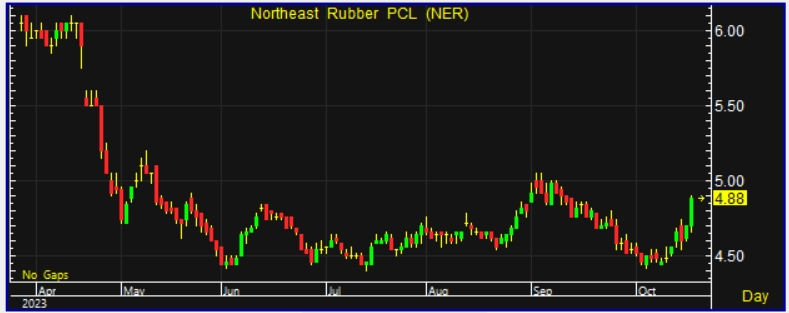 บทวิเคราะห์ บริษัทหลักทรัพย์ หยวนต้า (ประเทศไทย) จำกัด ประเมินว่าราคาหุ้นกลุ่มยางพาราจะปรับตัวขึ้น คาดตอบรับมาตรการกระตุ้นเศรษฐกิจจีน ซึ่งน่าจะส่งผลดีต่ออุตสาหกรรมยานยนต์ของจีน และหนุนต่อความต้องการล้อยางมากขึ้น ประกอบกับราคายางพารา SICOM ปรับตัวขึ้น และคาดว่าจะเป็นบวกต่อผลการดำเนินงานของกลุ่มยางพาราในไตรมาส 4/2566 แนะนำ “ซื้อ” NER ให้ราคาเป้าหมาย 6.20 บาทต่อหุ้น เนื่องจากคาดกำไรไตรมาส 4/2566 เติบโตเด่นที่สุดในหุ้นกลุ่มยาง จากราคายางที่ทรงตัวสูงต่อเนื่องในไตรมาส 4/2566 รวมทั้งต้นทุนการผลิตยังมีสต๊อกเก่า และค่าไฟลดลง บวกกับคาดไตรมาส 1/2567 กำไรมีลุ้นกลับไประดับมากกว่า 600 ล้านบาทได้