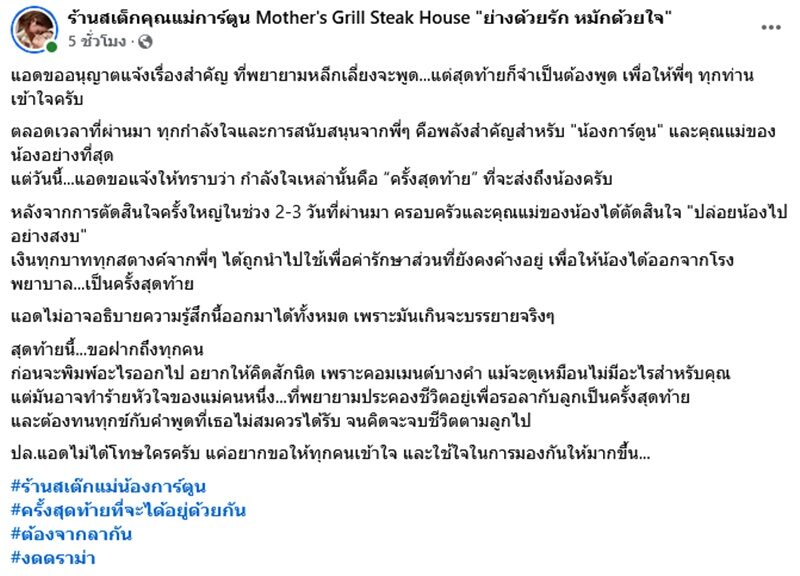 อาลัย น้องการ์ตูน แม่-ครอบครัวตัดสินใจครั้งใหญ่ ปล่อยน้องไปอย่างสงบ #ร้านสเต๊กแม่น้องการ์ตูน เผยเงินทุกบาททุกสตางค์จากพี่ๆ ถูกนำไปใช้ให้น้องได้ออกรพ.ครั้งสุดท้าย คอมเมนต์สุดเศร้าไม่เจ็บทรมานแล้ว