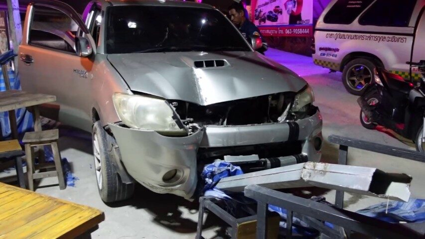 นายจักรพันธ์ (สงวนนามสกุล) อายุ 53 ปี คนขับกระบะ อยู่ในอาการมึนเมาคุยไม่รู้เรื่อง บอกว่ารถของตนไม่มีประกัน ไม่มี พ.ร.บ. ไม่ได้ต่อภาษี ไม่มีใบขับขี่ และไม่มีเงินจ่ายค่าเสียหาย พร้อมโดนจับติดคุก โดยหลังเลิกงานกินเบียร์มา 3 กระป๋อง เพื่อแก้เครียด ก่อนขับรถกลับห้อง แต่เกิดเสียหลักพุ่งชนร้านก๋วยเตี๋ยว ซึ่งตำรวจนำตัวไปตรวจแอลกอฮอล์เพื่อดำเนินคดีต่อไป
