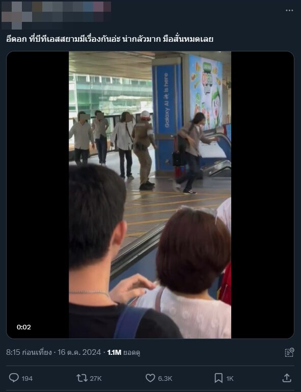 ผู้เห็นเหตุการณ์เล่าว่า กำลังจะไปเปลี่ยนขบวน ตอนเปิดประตูออกมามีตำรวจจับกุมอยู่ แต่ไม่ได้เอะใจอะไร พอลงมาบันไดเลื่อนไปก็เจอตีกันตามในคลิปเลย ตอนนั้นเด็กช่างวิ่งกันชุลมุน ตำรวจยังจับคนร้ายไม่ได้ คนที่ยืนรอบีทีเอสอยู่ก็ไปยืนหลบๆกัน