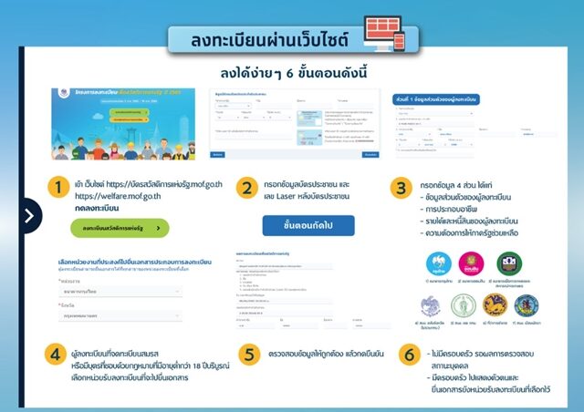 สำหรับเว็บลงทะเบียนบัตรสวัสดิการแห่งรัฐ 2568 หากเงื่อนไขการลงทะเบียนไม่มีอะไรเปลี่ยนแปลง คาดว่า กระทรวงการคลัง จะเปิดให้ลงทะเบียนเพื่อสวัสดิการแห่งรัฐ ปี 2565 ที่เว็บไซต์ มีขั้นตอนลงทะเบียน 6 ขั้นตอน ดังนี้