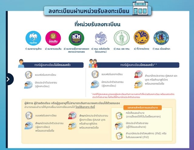 - ผู้ลงทะเบียนที่จดทะเบียนสมรส หรือ มีบุตรที่ชอบด้วยกฎหมายที่มีอายุต่ำกว่า 18 ปีบริบูรณ์ เลือกหน่วยรับลงทะเบียนที่จะไปยื่นเอกสาร