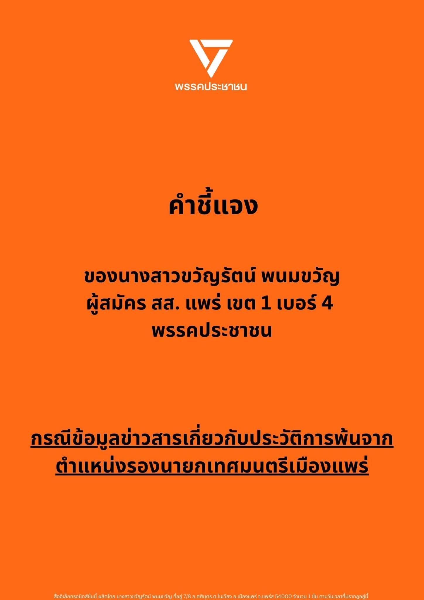 ล่าสุด น.ส.ขวัญรัตน์ พนมขวัญ ผู้สมัครรับเลือกตั้งเป็นสมาชิกสภาผู้แทนราษฎรจังหวัดแพร่ เขต 1 พรรคประชาชน หมายเลขผู้สมัคร 4 ขอชี้แจงต่อกรณีข้อมูลข่าวสารเกี่ยวกับประวัติการพ้นจากตำแหน่งรองนายกเทศมนตรีเมืองแพร่ ดังนี้