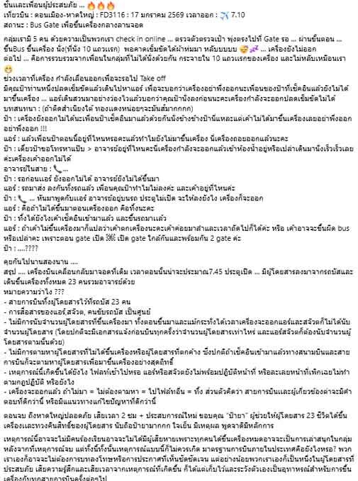 วันที่ 28 ม.ค.2569 มีเรื่องราวจากผู้ใช้เฟซบุ๊กรายหนึ่ง โพสต์เล่าประสบการณ์กับสายการบินดัง หลังจากที่ไปเจอเหตุการณ์ ลืมผู้โดยสารไว้บนรถบัสถึง 23 คน โดยผู้ใช้เฟซบุ๊กรยดังกล่าว โพสต์ระบุว่า ชั้นเเละเพื่อนผู้ประสบภัย เที่ยวบิน : ดอนเมือง-หาดใหญ่ 17 ม.ค.2569 เวลาออก : 07.10 น. สถานะ : Bus Gate เพื่อขึ้นเครื่องกลางลานจอด