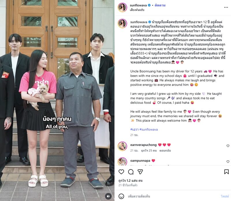 “น้าบุญเรืองคือคนขับรถที่อยู่กับเอวามา 12 ปี อยู่ตั้งแต่ตอนเอวายังอยู่โรงเรียนอยู่จนเรียนจบ จนทํางานในวันนี้ น้าบุญเรืองเป็นคนนึงที่ทำให้หนูหัวเราะได้เสมอเวลาเจอเรื่องอะไรมา เป็นคนที่มีพลังบวกให้คนรอบตัวเสมอ หนูดีใจมากๆที่ได้เติบโตมาและมีน้าบุญเรืองอยู่ข้างๆหนู ”