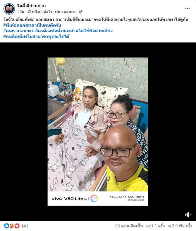 วิลลี่ ผีก้าบก้าบ ไปเยี่ยม เด๋อ ดอกสะเดา เผยอาการเริ่มดีขึ้นมาก ขอให้หายไวๆกลับไปเล่นตลกให้ได้ดูกัน พร้อมแคปชั่นเตือนสติดราม่า