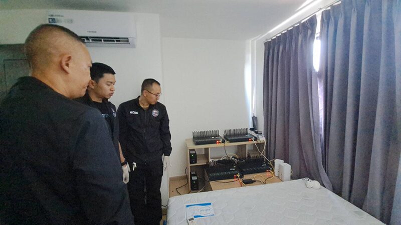 จากการตรวจสอบพบห้องดังกล่าวเปิดแอร์ ไว้ตลอดเวลา โดยไม่มีคนเข้าพักอาศัยอยู่ จากการตรวจสอบพบเครื่องซิมบ็อกซ์ห้องละ 4 เครื่อง รวม 8 เครื่อง โดยแต่ละเครื่องบรรจุซิมได้ 32 ซิม, กล้องวงจรปิด 2 ตัว, เราเตอร์ 4 เครื่อง, สายแลนสีเหลือง 4 เส้น, ปลั๊กไฟ 6 ชุด และอุปกรณ์สำรองไฟ 2 เครื่อง
