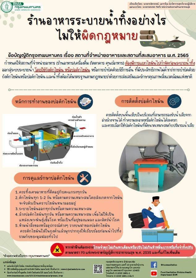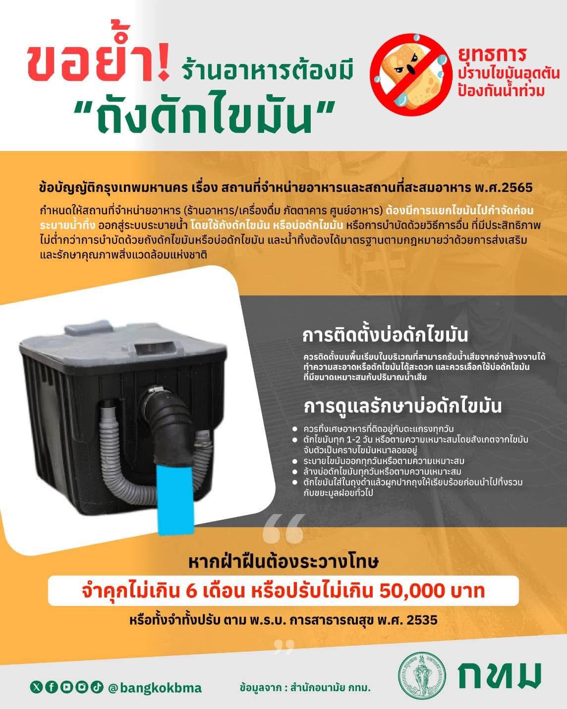 ทั้งนี้ ข้อบัญญัติกรุงเทพมหานคร เรื่อง สถานที่จำหน่ายอาหารและสถานที่สะสมอาหาร พ.ศ. 2565 กำหนดให้สถานที่จำหน่ายอาหาร เช่น ร้านอาหาร ร้านเครื่องดื่ม ภัตตาคาร และศูนย์อาหาร ต้องมีระบบแยกไขมันก่อนปล่อยน้ำทิ้งลงสู่ระบบระบายน้ำ โดยใช้ถังดักไขมัน บ่อดักไขมัน หรือวิธีบำบัดอื่นที่มีประสิทธิภาพไม่น้อยกว่าถังหรือบ่อดักไขมัน และน้ำทิ้งต้องเป็นไปตามมาตรฐานที่กำหนดตามกฎหมายว่าด้วยการส่งเสริมและรักษาคุณภาพสิ่งแวดล้อมแห่งชาติ