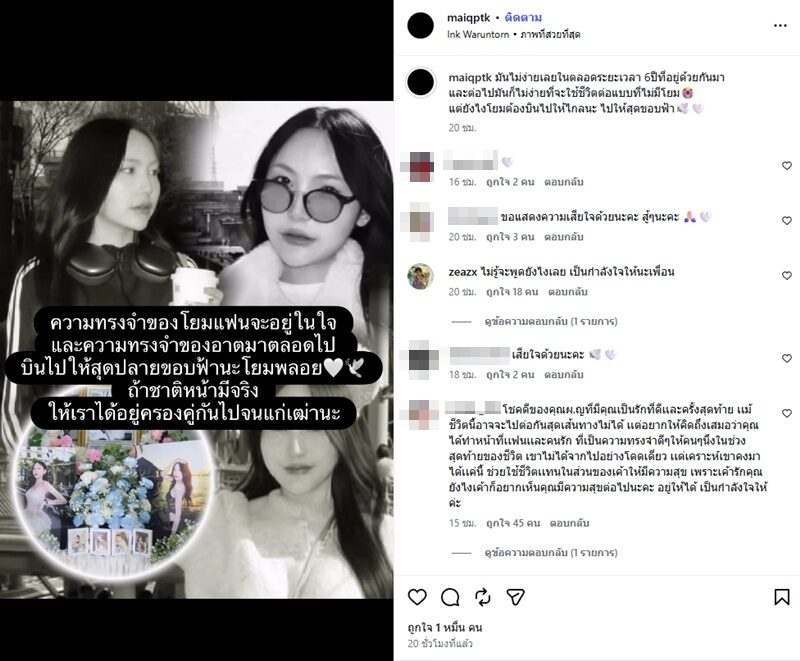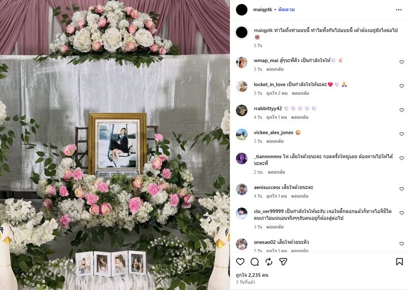 ขณะที่ ไม้คิว ธี่หยด นักแสดงที่รับบท ตาพวงตอนหนุ่ม ใน ธี่หยด2 แฟนหนุ่มโพสต์อาลัยเศร้าภาพงานศพและภาพวันวานของแฟนสาวครั้งยังมีชีวิต พร้อมข้อความสุดอาลัย อาทิ “ดอกคาเนชั่นสีฟ้าที่ที่รักอยากได้ในโอกาสสำคัญหน้า เค้าหามาให้แล้วนะ แต่ไม่ได้อยากให้เป็นวันสำคัญแบบวันนี้เลย , ขอบคุณตลอดระยะเวลา 6 ปี ที่ผ่านมานะ มันไม่ง่ายเลยและมันก็คงใช้ชีวิตต่อไปไม่ง่ายเหมือนกัน”