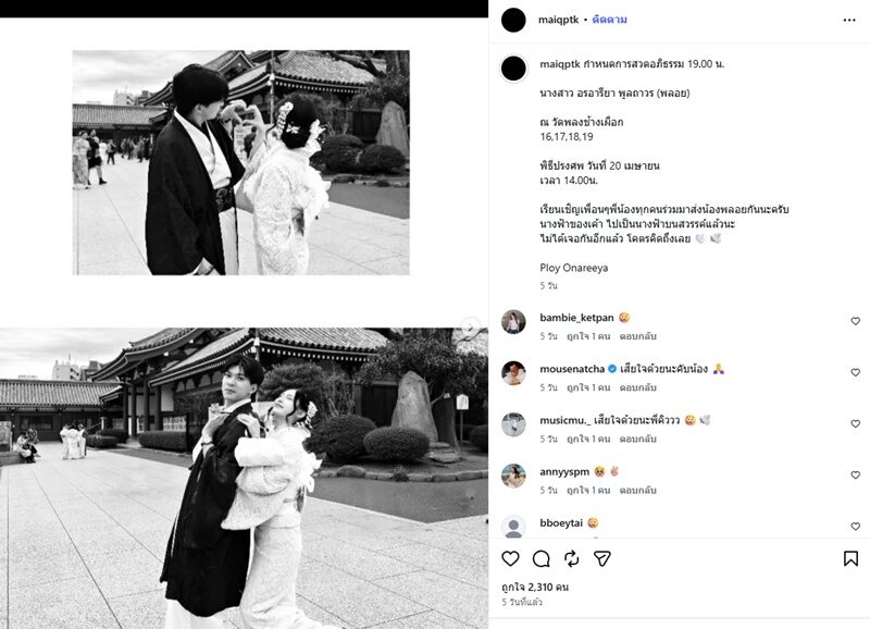 ล่าสุด ไม้คิว ซึ่งบวชอยู่ก็ยังได้โพสต์คลิปครั้งไปเที่ยวต่างประเทศกับ พลอย ด้วยกัน พร้อมข้อความสุดเศร้าคิดถึงด้วยว่า “ไปอยู่ไหนแล้วนะ , ทริปหน้าที่คุยกันไว้ต้องทำยังไงหละ แล้วจะต้องไปกับใคร ไหนรอตั้งใจไปด้วยกัน2คนไง”