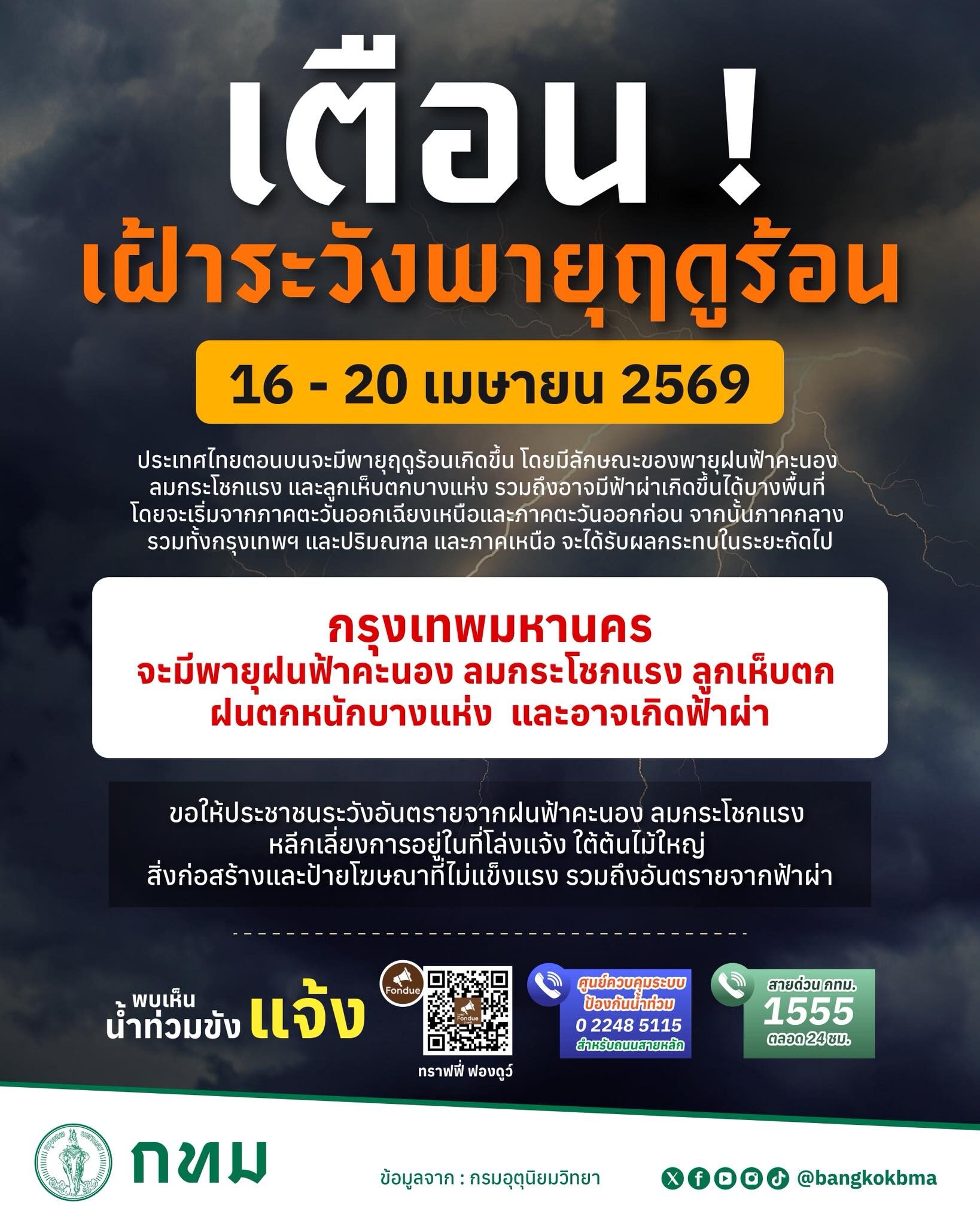 วันที่ 16 เม.ย.2569 กรุงเทพมหานคร โพสต์แจ้งเตือน 16 - 20 เม.ย. 69 เฝ้าระวัง พายุฤดูร้อน ความว่า วันที่ 16 - 20 เม.ย. 2569 ประเทศไทยตอนบนจะมีพายุฤดูร้อนเกิดขึ้น โดยมีลักษณะของพายุฝนฟ้าคะนองลมกระโชกแรง และลูกเห็บตกบางแห่ง รวมถึงอาจมีฟ้าผ่าเกิดขึ้นได้บางพื้นที่