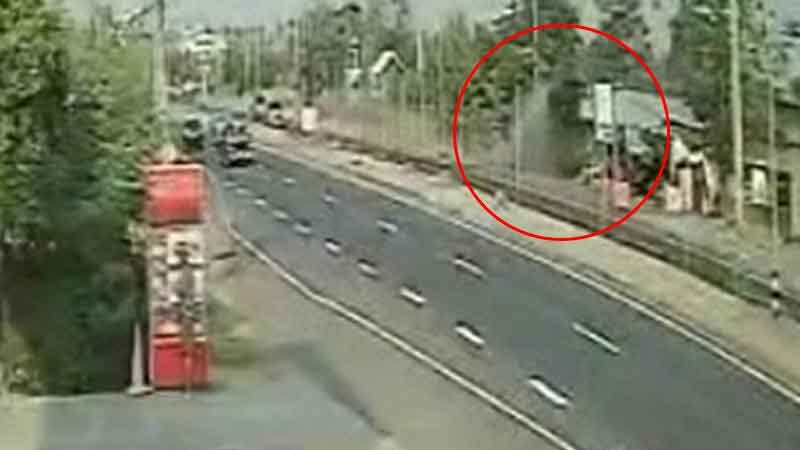 โดยขณะเกิดเหตุกล้องวงจรปิดบริเวณฝั่งตรงข้ามป้อม สามารถจับภาพขณะที่รถคันดังกล่าววิ่งมาด้วยความเร็วก่อนเสียหลักลงข้างทาง แล้วขึ้นเนินถนนจนรถตีลังกาเหินขึ้นฟ้าลอยข้ามรถตราโล่ ก่อนลงมาชนด้านหน้าป้อมยามและโครงหลังคาเหล็กจุดบริการประชนชนฝุ่นตลบ มีทรัพย์สินเสียหายและคนขับบาดเจ็บดังกล่าว