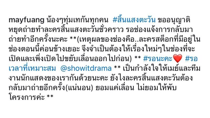 “(เหตุผลของช่องคือ..ละครสต็อกที่มีอยู่ในช่องตอนนี้ค่อนข้างเยอะ จึงจำเป็นต้องให้เรื่องใหม่ๆ ในช่องที่จะเปิดและเพิ่งเปิดไปขยับเลื่อนออกไปก่อน) #รอนะคะ #รอเวลาที่เหมาะสม @showitdrama เป็นกำลังใจให้เมย์และทีมงานนักแสดงของเรากันด้วยนะคะ ยังไงละครสิ้นแสงตะวันต้องกลับมาถ่ายอีกครั้ง(แน่นอน) ยอมแค่เลื่อน ไม่ยอมให้พับโครงการค่ะ”