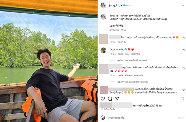 ล่าสุด"พี่จอง" ได้เคลื่อนไหวครั้งแรก ด้วยการโพสต์รูปตัวเอง พร้อมรอยยิ้มสดใส ผ่านไอจีส่วนตัว โดยมีแคปชั่นว่า"ผมคิดว่า ทุกๆ ทีมีทั้งดี และไม่ดี ผมอยากให้ทุกๆคน มองแต่สิ่งดีๆ เราจะเป็นคนที่มีความสุข