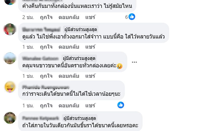 "ลักษณะเหมือนแช่ตู้เย็นมาหลายวันละ", "คลุมจนขาวขนาดนี้อันตรายทั่วกล่องเลยค่ะ", "กลัวอย่างเดียว กลัวป้าจะเอาแค่ถั่วงอกออกแล้วเอาเส้นกับลูกชิ้นไปขายต่อ"