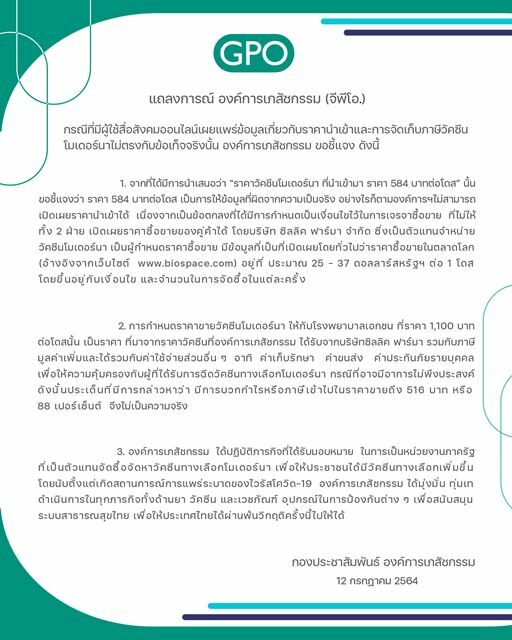 เมื่อวันที่ 12 ก.ค. องค์การเภสัชกรรม (จีพีโอ.) ออกแถลงการณ์ ​ถึง กรณีที่มีผู้ใช้สื่อสังคมออนไลน์เผยแพร่ข้อมูลเกี่ยวกับราคานำเข้าและการจัดเก็บภาษีวัคซีนโมเดอร์นา ไม่ตรงกับข้อเท็จจริงนั้น องค์การเภสัชกรรม ขอชี้แจง ดังนี้