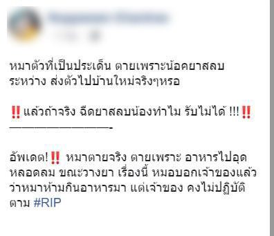 แต่ผลสุดท้าย โดนหาบ้านใหม่เพราะสาวเจ้าของดังกล่าวตัดสินใจไม่เลี้ยงต่อแล้ว แต่สุดท้ายก็เกิดเหตุการณ์ที่น่าสลดเมื่อเจ้าสุนัขที่เป็นประเด็นต้องมาตายขณะวางยาซึม
