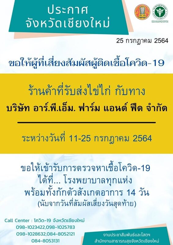 นอกจากนี้ ทางจังหวัดเชียงใหม่ยังออกประกาศว่า ขอให้ผู้ที่เสี่ยงสัมผัสติดเชื้อโควิด-19 โดยร้านค้าที่รับ-ส่งไข่กับทางบริษัท อาร์.พี.เอ็ม. ฟาร์ม แอนด์ ฟีด จำกัด ระหว่างวันที่ 11-25 ก.ค.64 ขอให้เข้ารับการตรวจหาเชื้อโควิด ได้ที่โรงพยาบาลทุกแห่ง พร้อมทั้งกักตัวสังเกตอาการ 14 วัน (นับจากวันที่สัมผัสเสี่ยงวันสุดท้าย)