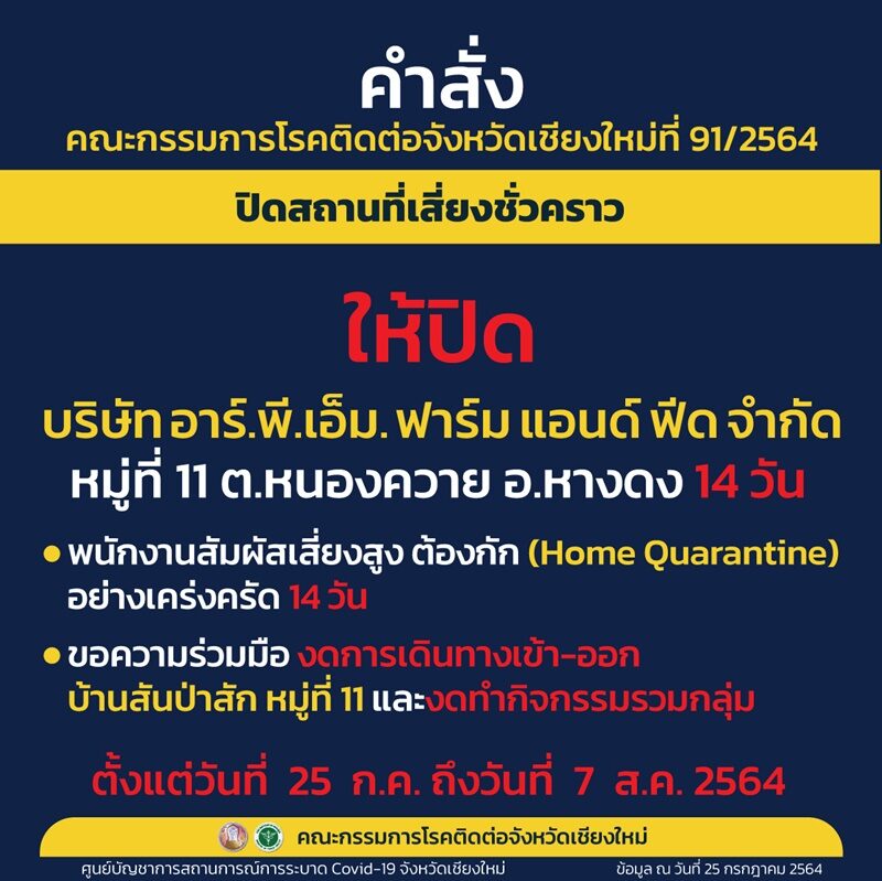 โดยบริษัทดังกล่าวมีพนักงานปฏิบัติงานอยู่จำนวนมากถึง 336 ราย และจากการตรวจหาเชื้อ (Swab) จำนวน 106 ราย เมื่อวันที่ 23 ก.ค.64 พบว่ามีผู้ติดเชื้อ 20 ราย และอยู่ระหว่างรอผลการตรวจหาเชื้อ (Swab) อีกจำนวน 221 ราย และวันที่ 25 ก.ค.ที่ผ่านมา ทราบผลเพิ่มอีก 41 ราย รวมเป็น 61 ราย คณะกรรมการโรคติดต่อจังหวัดเชียงใหม่ จึงมีมติออกคำสั่งที่ 91/2564 เรื่อง ปิดสถานที่เสี่ยงชั่วคราว โดยสั่งให้ปิดบริษัท อาร์.พี.เอ็ม. ฟาร์ม แอนด์ ฟีด จำกัด เป็นเวลา 14 วัน นับตั้งแต่บัดนี้