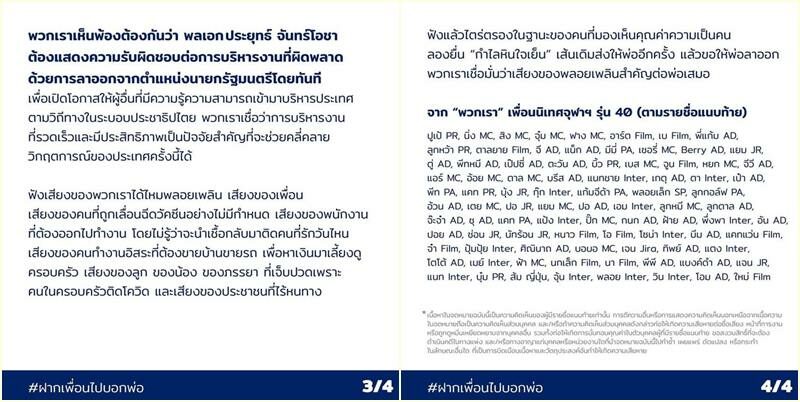 จากกรณีที่กลุ่มเพื่อนนิเทศจุฬาฯ รุ่น 40 ได้เขียนจดหมายถึง ‘พลอย-เพลิน’ ลูกสาวฝาแฝดของ พล.อ.ประยุทธ์ จันทร์โอชา โดยใจความในจดหมายได้กล่าวถึง ‘พ่อของเพื่อน’ นายกรัฐมนตรี ผู้นำของประเทศ ซึ่งได้มีการพูดถึงการบริการงาน นำเข้าวัคซีน รวมทั้งการควบคุมโรคโควิด