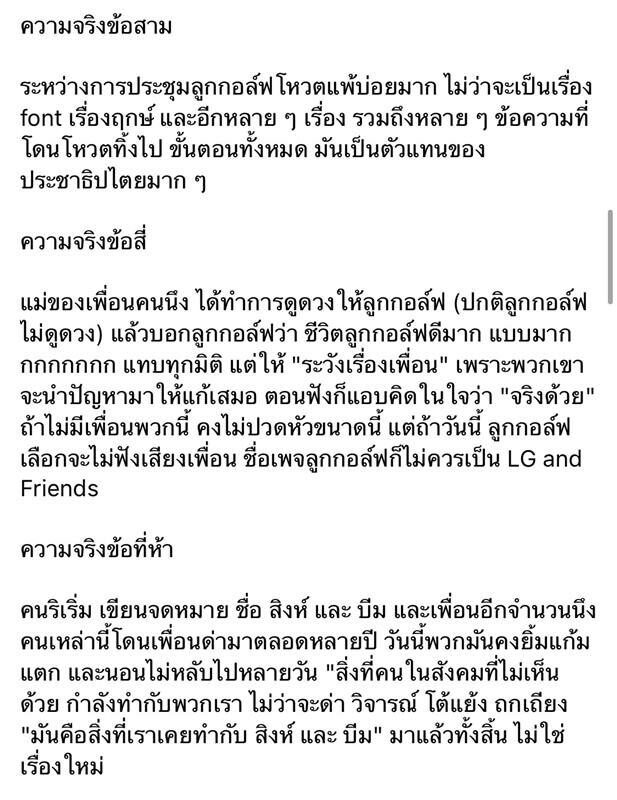 “ความจริงข้อสาม ระหว่างการประชุมลูกกอล์ฟโหวตแพ้บ่อยมาก ไม่ว่าจะเป็นเรื่อง font เรื่องฤกษ์ และอีกหลายๆ เรื่อง รวมถึงหลายๆ ข้อความที่โดนโหวตทิ้งไป ขั้นตอนทั้งหมด มันเป็นตัวแทนของประชาธิปไตยมากๆ”