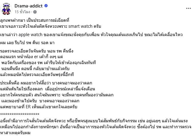 โดยระบุว่า "ลูกเพจฝากมา เป็นประสบการณ์เฉียดที่เขาเจอภาวะหัวใจเต้นผิดจังหวะเพราะ smart watch ครับ