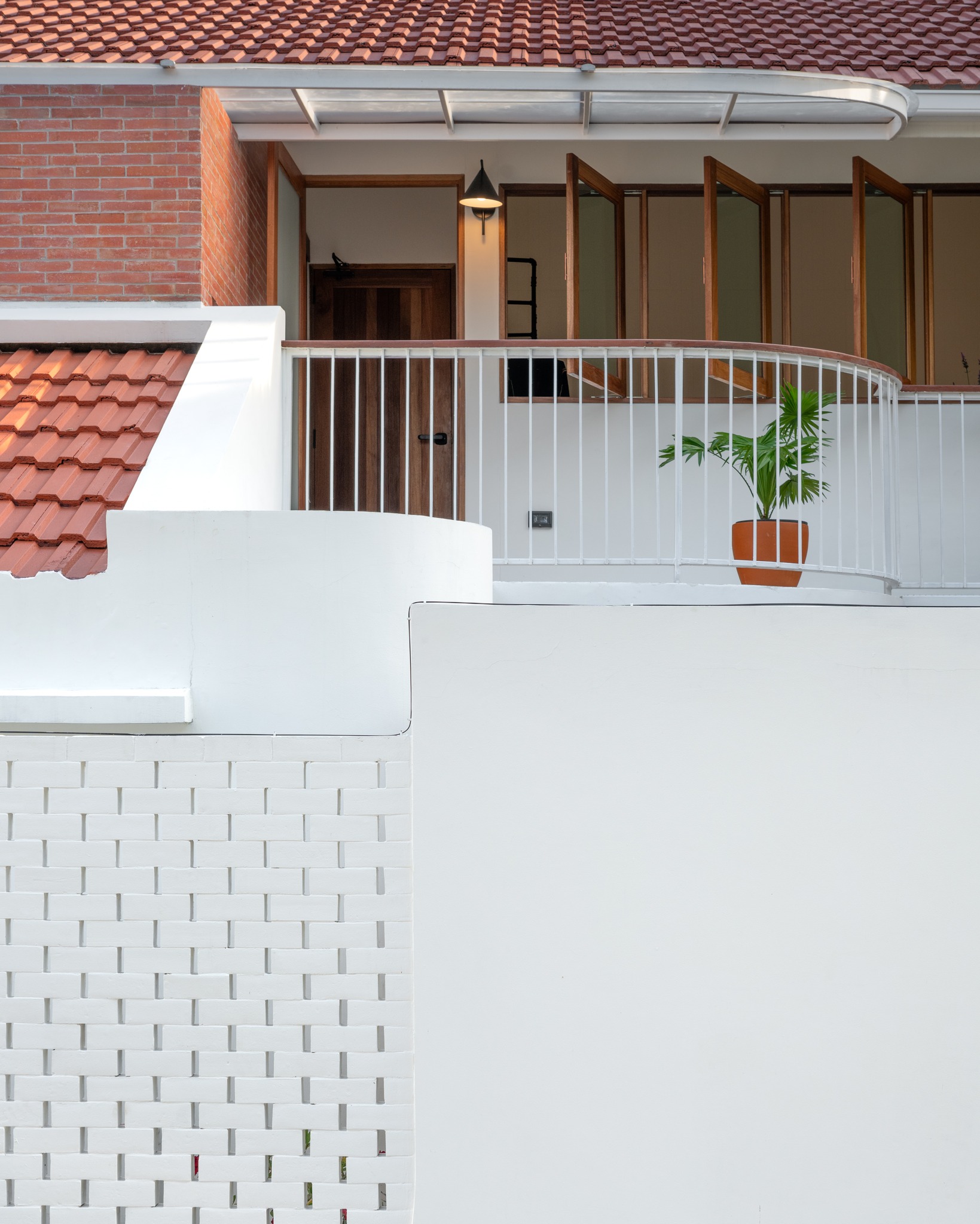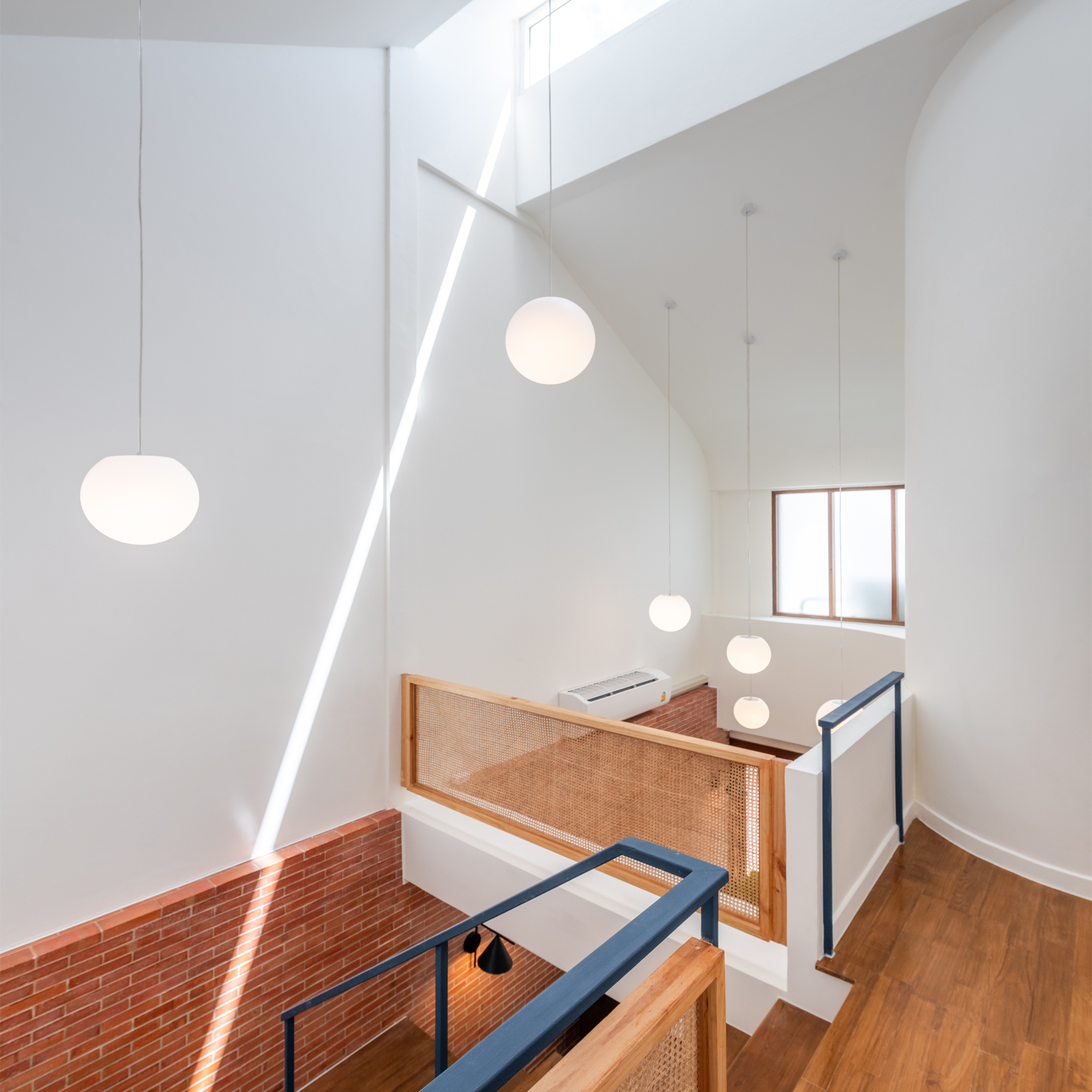 นอกจากแสงสวยๆ แล้ว ยังเพิ่มความนุ่มนวลด้วยเส้นโค้งมนๆ แทนเส้นตรงแข็งๆ ตั้งแต่รั้วหน้าบ้านยันซุ้มประตู ใช้โทนขาวอบอุ่นผสานวัสดุธรรมชาติสไตล์บ้านเชียงใหม่ดั้งเดิม ทั้งอิฐ กระเบื้อง และไม้ที่มีลวดลายสวย บันไดข้างสกายไลท์ก็ทำเรียบๆ ไม่บังแสง แต่เติมสีฟ้าเป็นจุดเด่นให้ดูทันสมัย