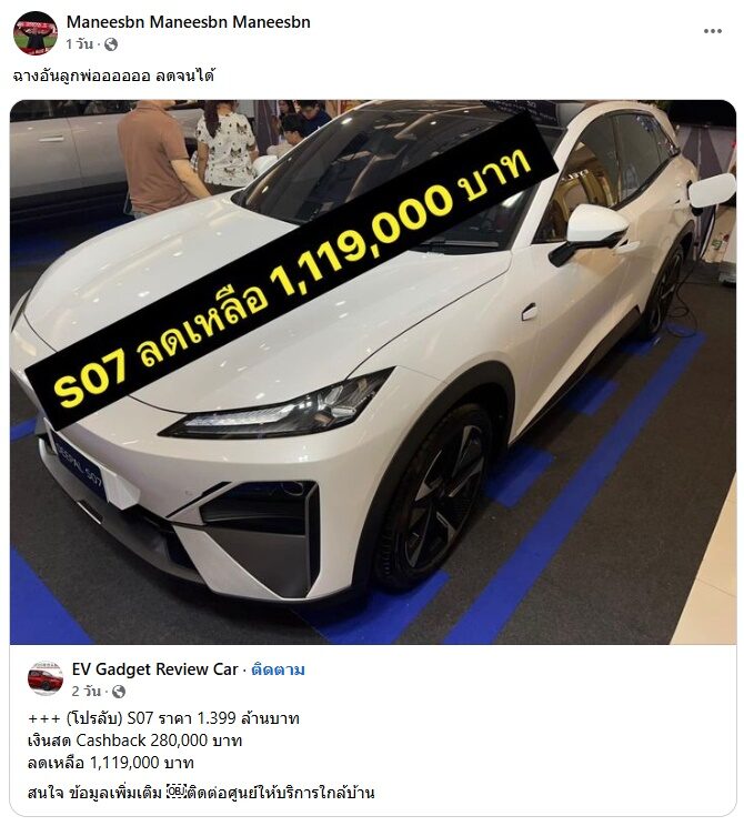 วันที่ 4 พ.ย.67 เฟซบุ๊กเพจ "EV Gadget Review Car" โพสต์โปรลดราคารถไฟฟ้าค่ายฉางอัน ซึ่งเป็นรุ่น S07 จากราคา 1.399 ล้านบาท เหลือ 1.119 ล้านบาท ซึ่งลดลงไปกว่า 2.8 แสนบาท