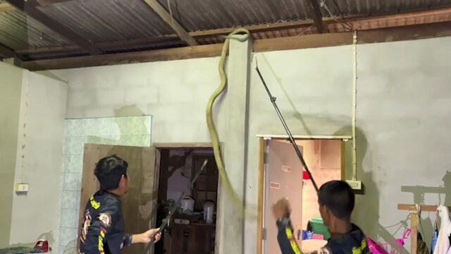 เข้าตรวจสอบที่บริเวณหลังคาห้องครัวด้านหลังบ้าน พบงูจงอางยักษ์สีเหลืองทอง เลื้อยอยู่บนคานบ้าน จึงได้เข้าทำการจับงูจงอาง โดยใช้เวลาไม่นานนักสามารถจับงูจงอางไว้ได้